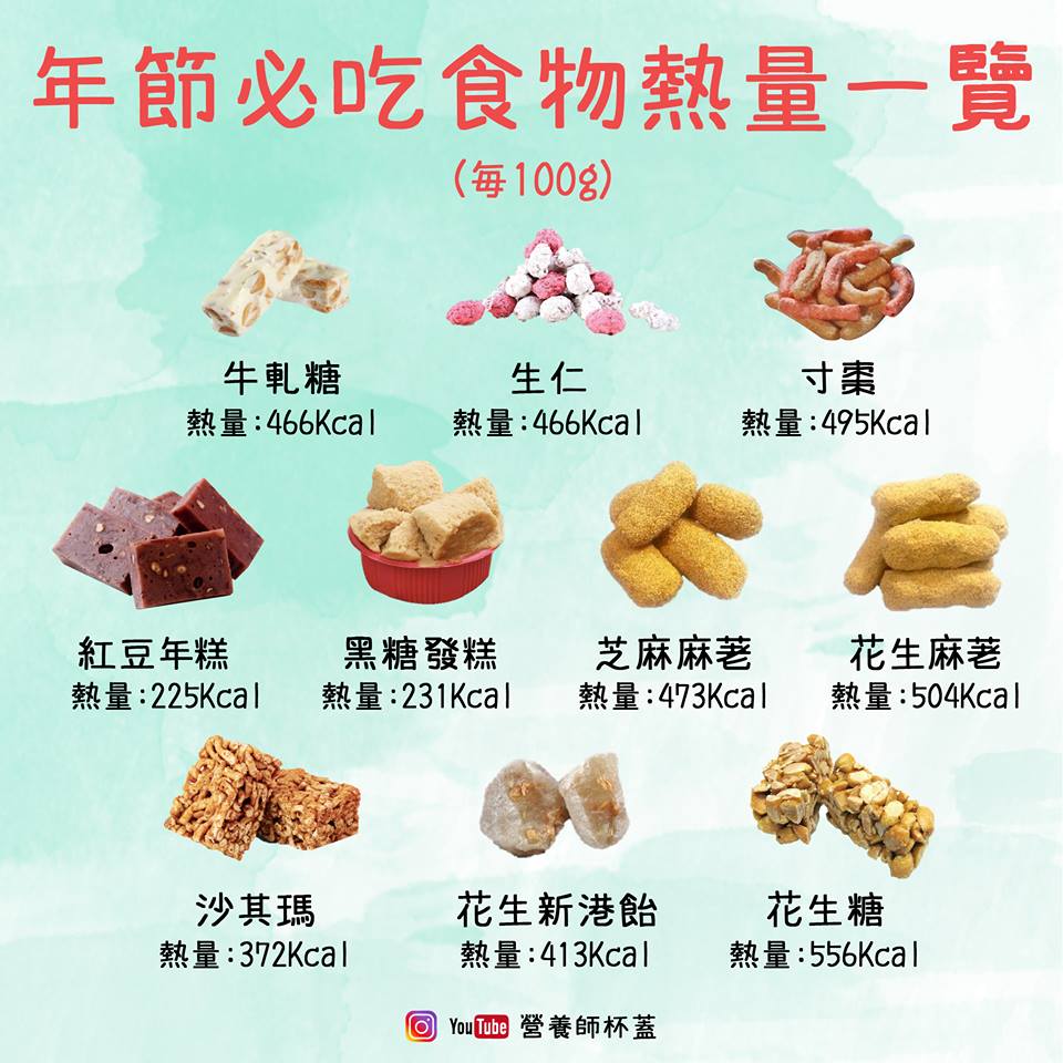 根據《新頭殼》報導,蕭瑋霖指出,一般過年時用的零食皆以瓜子、堅果、開心果、花生糖為主,每一百公克就有556大卡,若以花生糖市面上一桶販售600克來說,很快就會不小心吃掉3000大卡,熱量超驚人,而以開心果來說,每一百公克就有562大卡,在你越吃越涮嘴的同時,也在無形之中吃下了不少熱量。