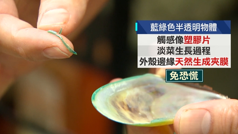 ▼藍綠色的半透明物體是淡菜生長過程中,天然生成的夾膜。(圖/東森新聞)