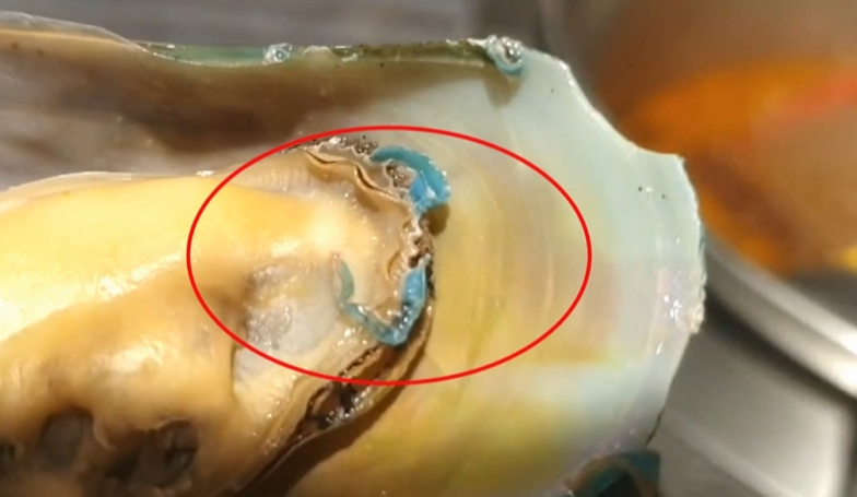 連鎖火鍋店用餐,煮熟的淡菜卻讓人忍不住一看再看,民眾用筷子撥啊撥,不只是淡菜的邊緣有一層藍綠色物質,甚至連可食用部位的邊緣,也有這層藍綠色物質黏住,細細長長的,還帶點透明狀,但沾黏在淡菜的可食用部位上,必須稍微用點力,才拔得掉,摸起來觸感就像塑膠一樣,讓民眾看了心驚驚。