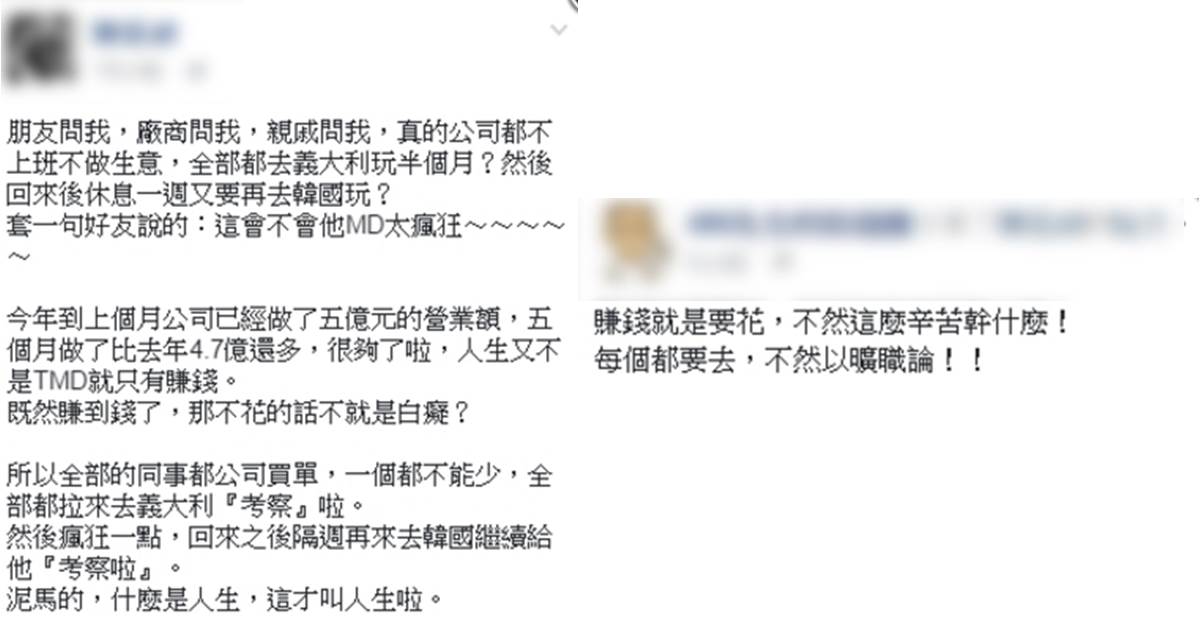 據了解,公司員工去義大利「考察」,回來後隔周再去韓國繼續「考察」,身邊的親戚、朋友、廠商都在問,「公司真的都不上班不做生意,全部都去義大利玩半個月?然後回來後休息一週又要再去韓國玩?」原PO表示,「因為公司今年前5個已經做了5億元的營業額,比去年整年4.7億元還多」他認為,「人生又不是只有賺錢,既然賺到錢,那不花的話不就是白癡?」所以要求全部的同事都要去,一個都不能少,不然以曠職論,公司會出錢。