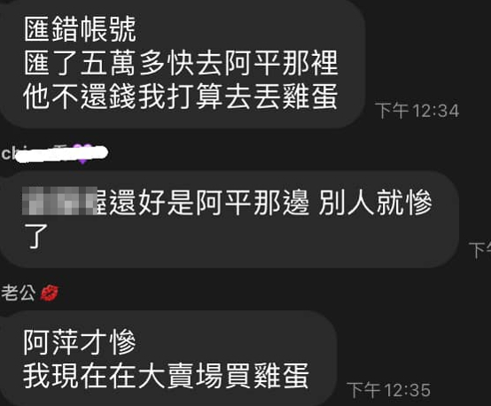 真相大白後,也讓這名人妻無奈的感嘆直呼,「媽媽我心淚,傳說中的老公都是別人的。」並附上的翻白眼的表情符號。從原PO分享的對話截圖可以看到,這名老公事後和朋友分享這起烏龍事件時,打趣寫到,老婆不還他錢所以他打算去丟雞蛋,友人還順便安慰他,還好是匯到老婆那,萬一匯到別人那邊就完蛋了,結果這名老公還繼續開玩笑回覆,「老婆比較慘,因為他人現在在大賣場買雞蛋。」