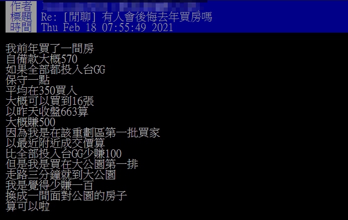 原PO說明,當時因為他是重劃區第一批買家,以最近成交價算,他會比全部投入台積電股票少賺100萬,想想雖然有些可惜,但原PO也覺得自己房子買在大公園第一排「少賺100萬換成一間面對公園的房子,算可以啦」,文章發出後也吸引許多人討論。