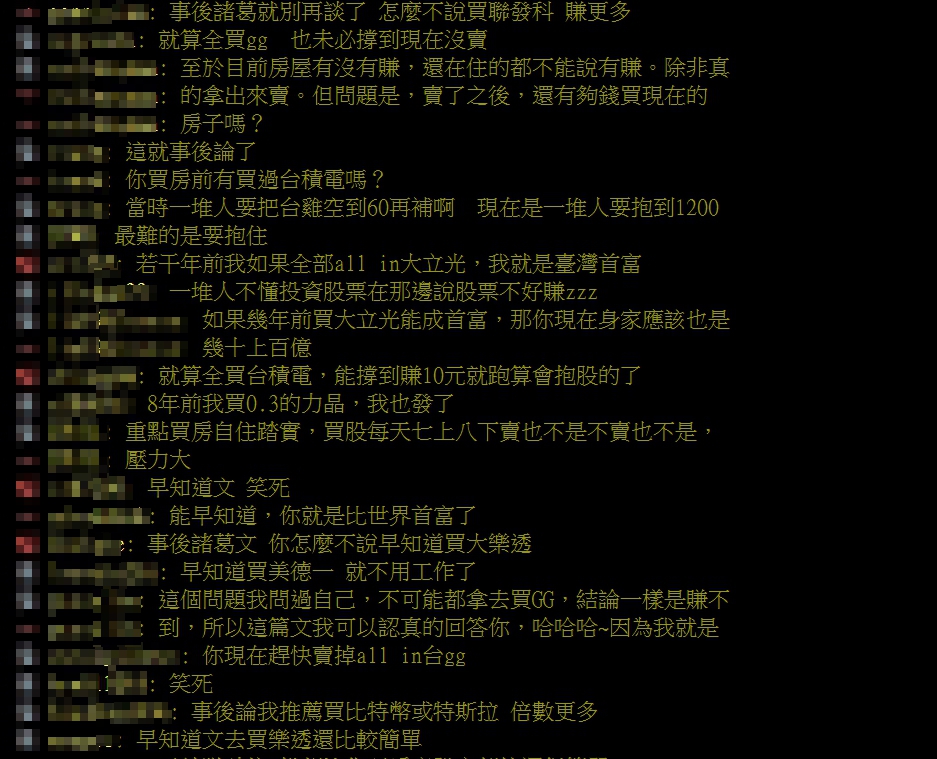 大家看到後紛紛表示「你都跑去買保守的房,當初的氛圍不可能all in買台積電股票」、「就算你沒買房子,也不可能全買股票」,也有人表示,原PO應該要慶幸去年買房,因為比起沒資產的人,他已經贏一半了,還有人覺得原PO根本是事後諸葛,直言「能早知道,你就是比世界首富了」、「早知道文去買樂透還比較簡單」,從留言來看,大部分的網友都認為原PO想那麼多也沒用,畢竟沒人知道未來會發生什麼事。