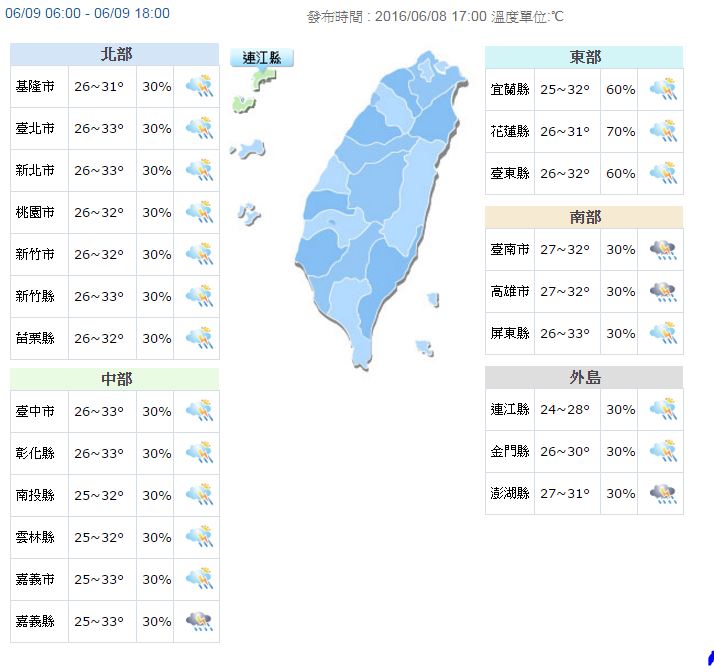 天氣不穩定,各地都有局部陣雨或雷雨的出現,週五、週六雨時會比較長,雨勢也會比較大,外出時要多留意天氣變化。