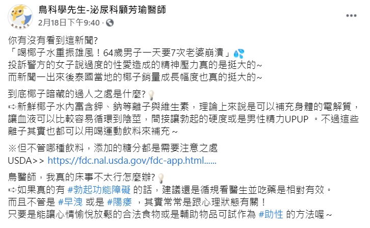 無奈之下人妻最後竟然選擇報警處理,讓該起事件為大家所知,更因此帶動泰國當地的椰子水生意。對此,泌尿科顧芳瑜醫師看到之後也在臉書發文揭開椰子水的奧妙,顧芳瑜表示,新鮮的椰子水內富含鉀、鈉等離子與維生素,可以補充身體的電解質,讓血液可以比較容易循環到男性下體「間接讓勃起的硬度或是男性精力提升」。