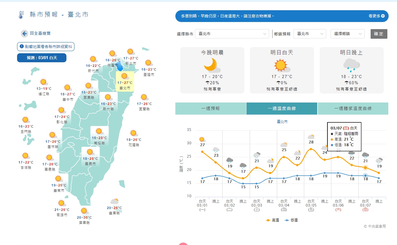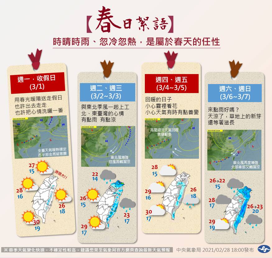 氣象局今天說,未來一週北台灣溫度起伏大,明天至3日北部、東北部高溫攝氏20至22度間,降幅約8至10度,中部以北、東半部有短暫雨;4、5日天氣回穩,但6至8日又再轉溼降溫。