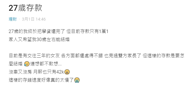 一名男網友在Dcard發文,透露自己今年27歲,沒車沒房、
