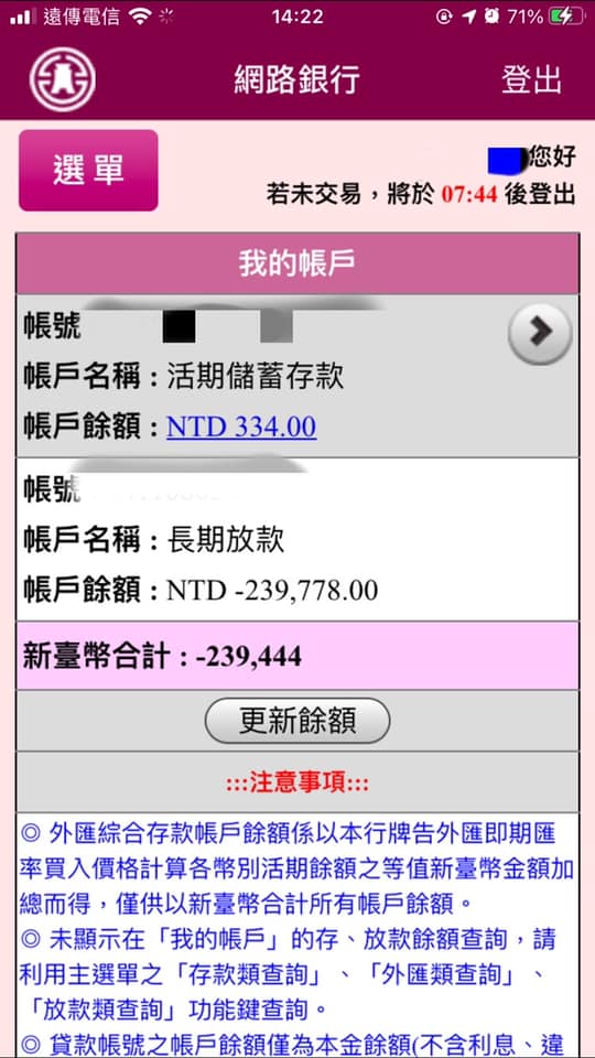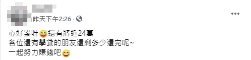 原PO在臉書社團「爆廢1公社」發文,表示自己「心好累呀,還有將近24萬元,各位還有學貸的朋友還剩多少還完呢,一起努力賺錢吧」,從她貼出的網路銀行截圖可以看到,原PO目前仍有仍有23萬9444元要還,但戶頭餘額卻只剩334元,遠遠不夠償還貸款。