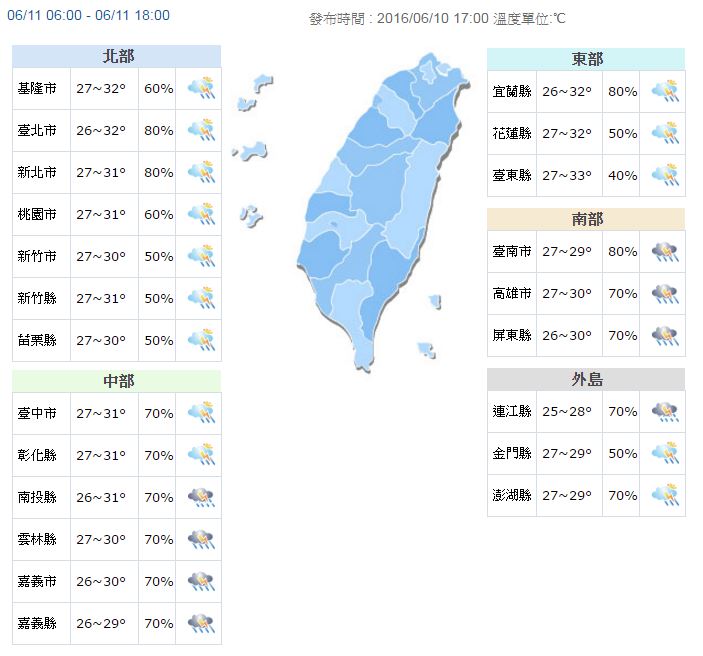 氣溫方面,明天全台高溫大約31到32度,而南部地區因為下雨的關係,高溫稍降,約29到30度左右,此外,明天北部地區及宜蘭降雨機率50%到80%,中部及南部地區70%到80%,花蓮、台東40%到50%,因此建議民眾外出時要隨身攜帶雨具,嚴防瞬間大雨,以免淋成落湯雞。