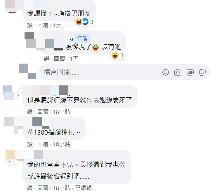 該篇PO文一發出,立即引發大批網友熱烈討論,網友紛紛留言安慰原PO,「或許都是孽緣,神明都幫妳擋掉了,往好處想吧」、「是妳的躲不過,不是妳的強求不來」、「但是聽說紅線不見就代表姻緣要來了」、「花1300擋爛桃花」、「我也是聽說紅線不見就是遇到對的人欸」、「時間到就會莫名的脫單了啦」、「我戴了8年!連隻蟑螂都沒有」、「自己去買紅線去月老廟過火就好了,還花1300元要不要緊?」。