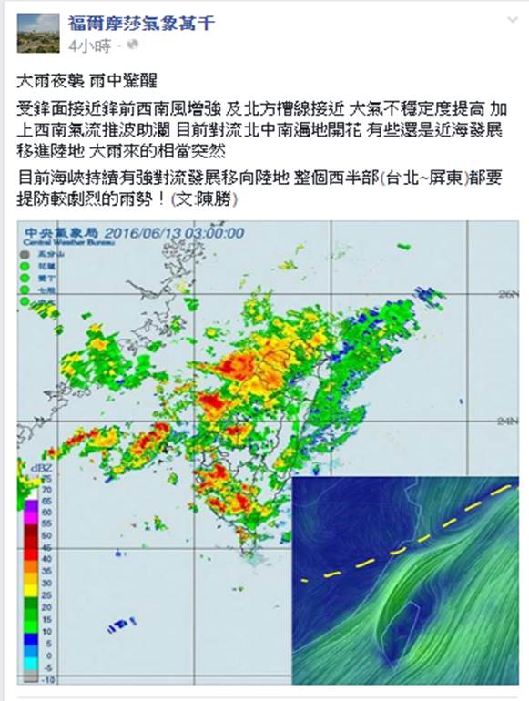 民間氣象人員成立的臉書社團「福爾摩莎氣象萬千」提醒,受鋒面接近,大氣不穩定度提高,加上西南氣流推波助瀾,目前對流在北中南遍地開花,有些還是近海發展移進陸地,大雨來的相當突然,目前海峽持續有強對流發展移向陸地,整個西半部都要提防較劇烈的雨勢。
