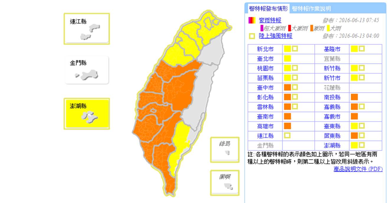 天氣不穩定,桃園以北地區亦有局部較大雨勢發生,請注意雷擊、強陣風,中南部地區有陣雨或雷雨,西半部較容易有短時強降雨。中央氣象局預報中心主任鄭明典13日早上在臉書發文,「雨帶連續,還在發展中,這一波雨勢持續時間會比較長」。提醒民眾注意雷擊、強陣風,山區也應慎防坍方落石、土石流及溪水暴漲,低窪地區請慎防淹水。