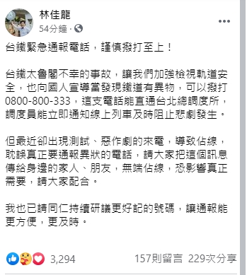 台鐵緊急通報電話被民眾亂打一通,造成工作人員相當繁忙,而交通部長林佳龍也趕緊在今(10)日晚間PO文呼籲民眾,近期因時常出現測試、惡作劇的來電,希望民眾不要刻意打來測試佔線,而他也請同仁持續研議更好記的號碼,希望能讓通報能更方便,更及時。