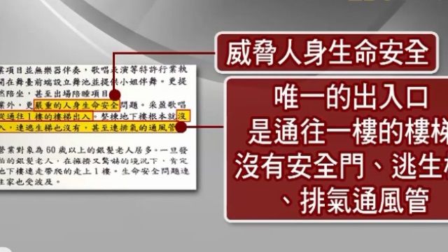 舞台上的來賓歌聲四射,舞池上的民眾扭腰擺臀,這家開在地下室的歌舞坊,營業時間都非常的HIGH,但是卻被爆料是違法經營。打開投訴信,上面寫到這家歌舞坊威脅到人身生命安全,沒有安全梯、排煙系統,甚至只有單一出口可以逃生,因為顧客都是上了年紀的民眾,如果發生火災傷害難以想像,但歌舞坊的老闆娘有話要說。歌舞坊老闆娘周淑卿:「消防人員都有來檢驗過了,全部都合格,那中間還有逃生梯,就是梯子逃到一樓的,然後往那邊去又有一個出口,所以我們有三個出口。」