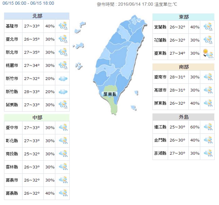 今(15)天西南氣流將減弱為西南風,中南部地區受其影響,雖然還是有短暫陣雨或雷雨,但是降雨的時間和雨勢都會變得比較少,而其他地區則是回復以午後雷陣雨為主的夏季