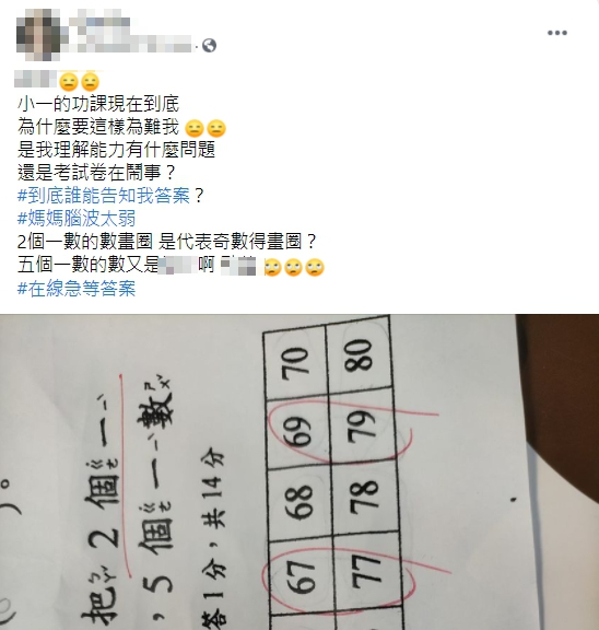 一名媽媽網友在臉書「爆怨2公社」PO文表示,小一孩子的數學功課難得離譜,她研究了許久仍然摸不著頭緒,她將題目拍照後上傳臉書,讓廣大網友幫忙解惑。只見題目中敘述著,從61開始,把2個一數的的數畫圈,把5個一數的數打勾,她表示「2個一數是代表把奇數畫圈?5個一數的數又是OO啊」,她滿頭問號,「是我理解能力有什麼問題,還是考卷在鬧事?」
