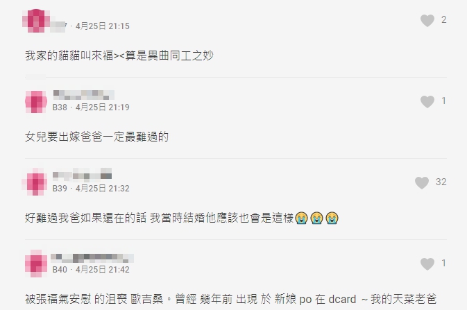 近日一名女網友在Dcard發布一則暖心的貼文。貼文內容說到她即將要結婚了,爸爸不捨女兒出嫁,抱著家中飼養的貓咪「張福氣」,失魂落魄的呆坐在沙發上,女網友家人在對話中向她透露「只有張福氣,能安慰你爸的心情」。眾人看到女網友爸爸向貓咪討拍的模樣,忍不住直呼「爸爸太可愛了吧!」