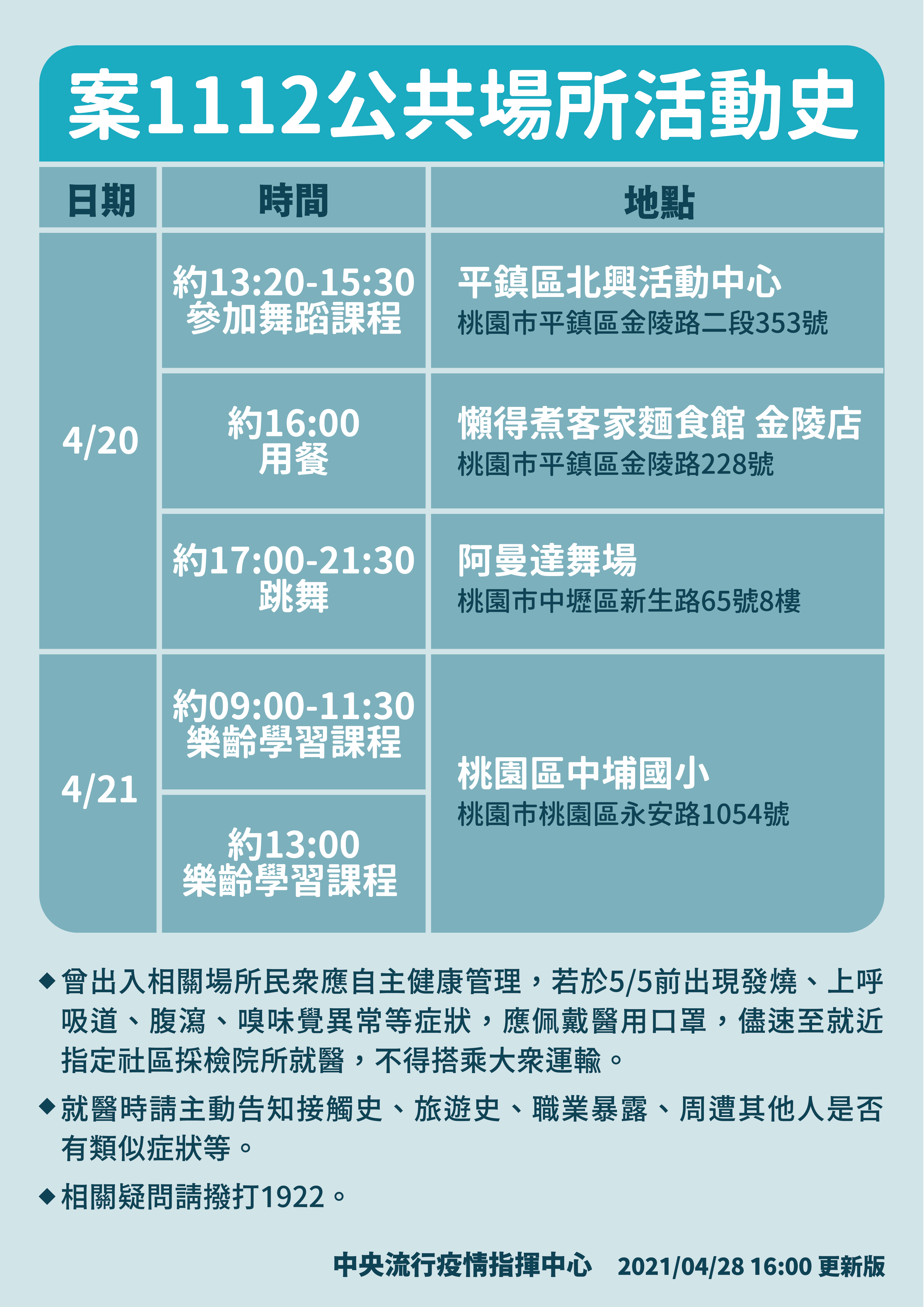 據了解,案1112為本國籍70多歲男性,為境外移入個案(案1068、案1106)之非同住家人,近期無出國史,亦無疑似症狀,曾因案1068居家檢疫期間於住處跌倒,前往該案住處停留半個多小時,另於案1106居家隔離期間,協助送餐事宜。衛生單位於4月26日安排案1112進行接觸者採檢,於今日確診(Ct值26)。已初步掌握個案接觸者190人,列居家隔離。另由於個案曾有公共場所活動史,因此公布足跡圖提醒曾於所列時間及場所活動的民眾,自主健康管理14天,如有疑似症狀,請儘速戴口罩就醫,並主動告知醫師活動接觸史。