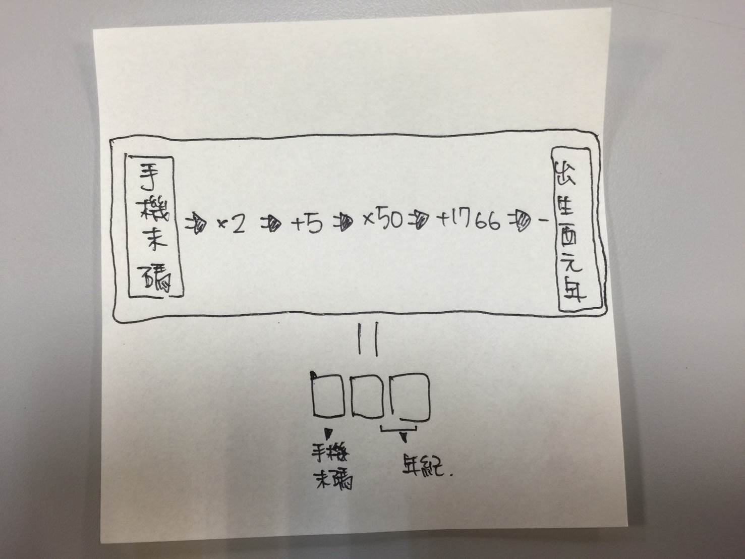 先將手機號碼最後一個數字X2,接著+5,然後X50,得到的答案再+1766,最後再將數字減掉出生的西元年份,會得到3位數字,百位數字為手機尾數,剩下兩個數字就是計算者的真實年齡。