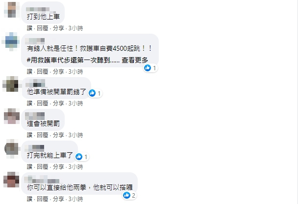 網友看到PO文紛紛留言譴責張男的行徑,「去吧!把他打到可以上救護車的程度」「浪費醫療資源」「林娘卡好大水餃」「有靈車可以搭」「不是傷患人員,使用者付費囉」。新北市消防局救災救護指揮中心也提醒民眾,若非緊急,不要無故撥打119或謊報火警,否則將依違反消防法36條,開罰3,000元到1萬5,000元。