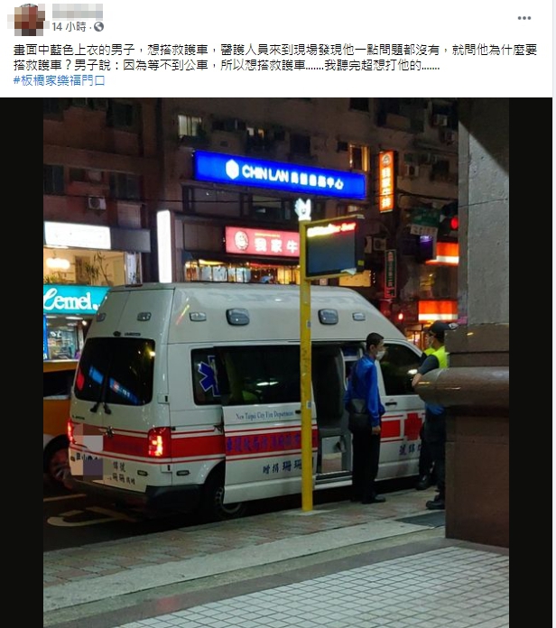 對於張男的行為,救護人員感到相當傻眼,只能摸摸鼻子離去。有民眾目擊過程,拍照PO上臉書「爆料公社公開版」,表示:「醫護人員來到現場發現他一點問題都沒有,就問他為什麼要搭救護車?男子說:因為等不到公車,所以想搭救護車……我聽完超想打他的。」