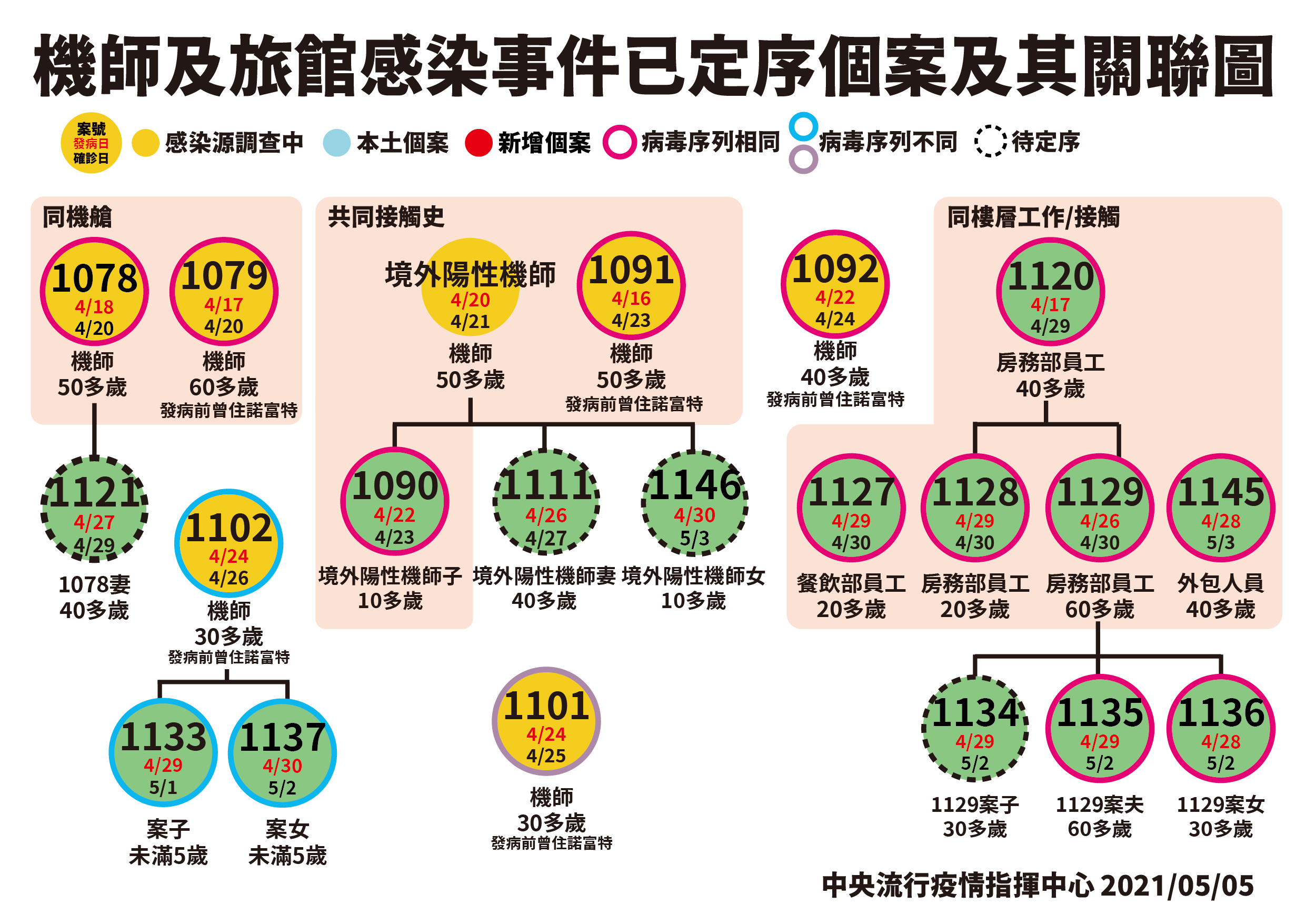 同時他們的基因序列又和華航4位機師都一樣,研判這次群聚的英國變異株造成了華航機師和諾富特旅館事件。此外,案1102的2位小孩案1133和1137都和案1102的基因序列一樣,不過他們和華航機師所感染的英國變異株有所差異,羅一鈞指出,2者之間有3個到4個位點的差異,目前看起來是獨立的個別事件。
