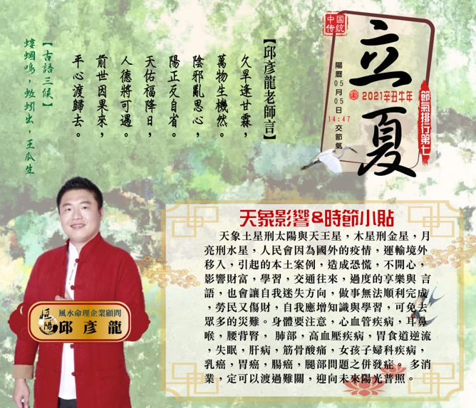 邱彥龍也在臉書表示:「久旱逢甘霖,萬物生機然。陰邪亂思心,陽正反自省。天佑福降日,人徳將可遇。前世因果來,平心渡歸去」,他提醒每個人都應增知識與學習,就可免去眾多的災難,立夏天象影響身體,要注意心血管疾病、耳鼻喉、腰背腎、肺部、胃食道逆流…等,女性則需更加注意婦科疾病,「多消業,定可以度過難關,迎向未來陽光普照」。