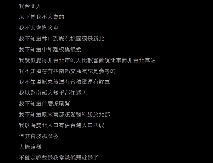 更有一位台北網友特別發文列出10點,表示以下都是他不知道的事情,他大方承認自己不太會搭火車、不知道林口到底在桃園還是新北、不知道中和離板橋很近、不知道什麼虎尾幫,也搞笑表示,自己是後來才發現「有些南部交通號誌是參考的」,也以為南部人幾乎都住透天、超愛醫科勝於北部,而龍潭有台積電還有駐軍,更以為雙北人口有佔台灣人口4成,其中這位台北網友也提到「我疑似覺得非台北市的人比較喜歡說北車,而非台北車站」。