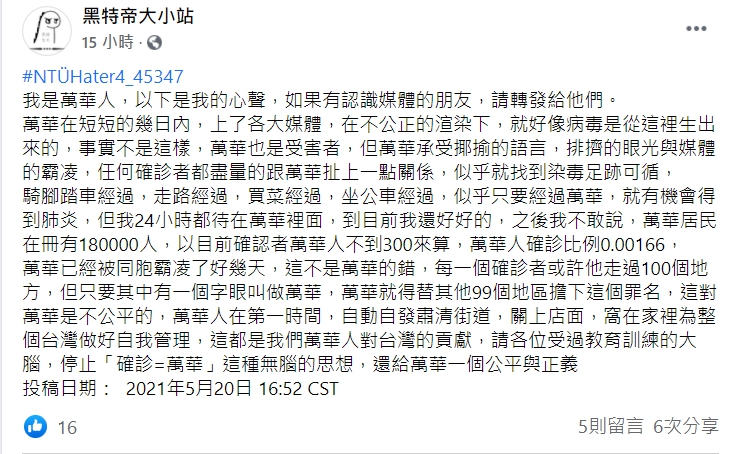 本土疫情持續擴散,其中萬華爆出了許多確診案例,因此許多人認為「確診=萬華」,令一名網友不滿的在臉書發文表示「不要再霸凌萬華」,並痛心的說萬華也是受害者,呼籲大家停止獵巫,並還給萬華公平和正義。