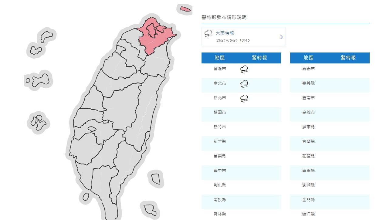 大雨特報地區包含基隆市、台北市及新北市。