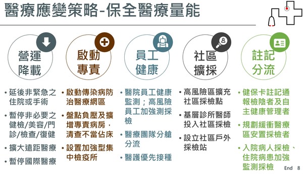 指揮中心日前強調,目前尚無升四級之必要,並將採取相關應變措施,強化防疫量:全國標準一致,地方一體執行,以指揮中心發布之指引與標準貫徹執行。地方若有資源及人力不足之處,指揮中心全力協調、協助;指揮中心邀集地方政府每日召開全國防疫會議,由陳宗彥副指揮官、衛生福利部石崇良次長主持,整合防疫資源、檢視執行進度、駁斥錯誤不實訊息,會議後將增開一場記者會,由陳副指揮官澄清錯誤不實訊息。