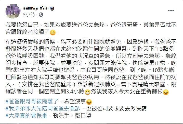 台灣本土疫情嚴峻,全國進入第三級防疫警戒,指揮中心也呼籲民眾避免非必要的移動,近日一名網友就自責發文,提到因為爸爸不舒服,送他到醫院掛急診,沒想到因為隔壁床的患者確診新冠肺炎,導致現在不僅爸爸,連同哥哥弟弟都要隔離快篩,讓原PO不禁愧疚表示「如果沒說要送爸爸去急診,是否就不會跟確診者接觸了。」