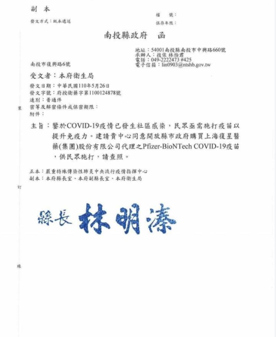 ▼南投縣政府正式發出公文,盼中央授權購買疫苗。(圖/翻攝畫面)