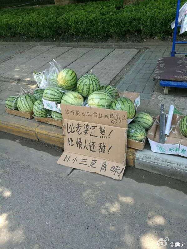 照片中可以看到,西瓜堆裡有個手寫的宣傳牌,上面寫著「比老婆還熟,比情人還甜,比小三更有味」,網友問這是繼「雷夢」、「乾媽」的幽默攤販「趴兔」篇嗎?老闆用幽默的形容詞來凸顯自己所買的西瓜既熟、甜又有風味,也讓許多網友大讚「老闆是個人才啊!」由於宣傳牌有多個簡體字,因此網友認為這地點應該是在大陸。