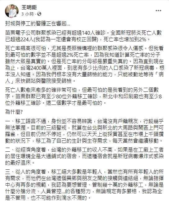 台灣本土疫情持續延燒,全國升至第三級警戒,苗栗科技大廠日前更爆發群聚感染,目前已有140人確診,台大癌醫副院長王明鉅對此表示,「封城與停工的警鐘正在響起」,疫情演變至今,繼續維持三級警戒不可能控制得住,若選擇不讓經濟垮掉而堅持不升至第四級警戒,代價將是「重症者與死亡者的人數會越來越高」,他更指出四個關鍵,表明移工問題和這一波台灣的疫情息息相關。