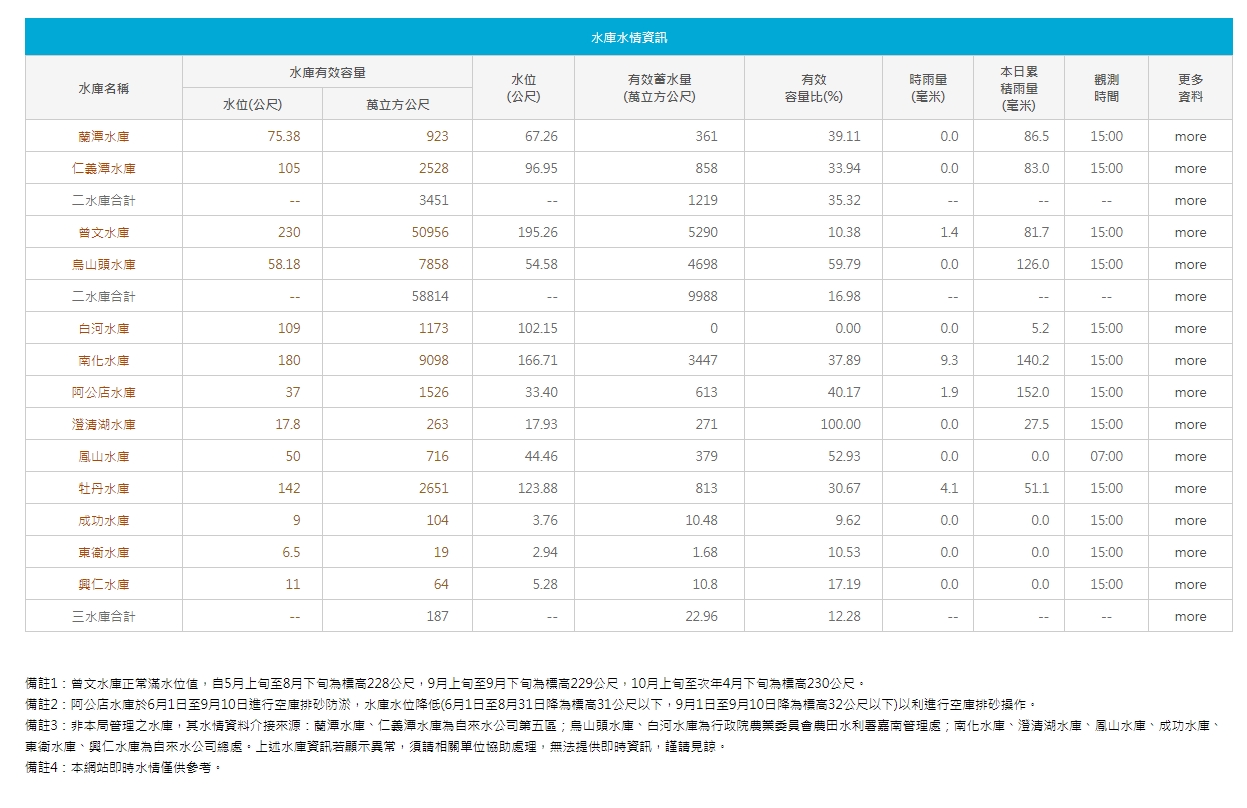 南區水資源局下午1時的觀測資料顯示,曾文水庫蓄水量5134萬立方公尺,蓄水率10.08%,烏山頭水庫蓄水量4668萬立方公尺,蓄水率59.4%,南化水庫蓄水量3401萬立方公尺,蓄水率37.38%。