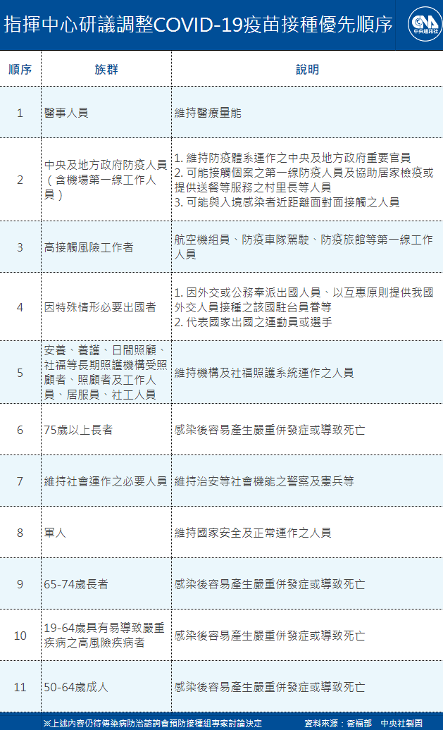 19至64歲具有易導致嚴重疾病高風險疾病者及罕見疾病及重大傷病從9順位改為10順位,原第10順位的50-64歲成人後移為11順位。陳時中強調,因長者染疫後,重症、死亡風險較大,考慮將此族群接種順位往前移,「這是一個方向」,仍待傳染病防治諮詢會預防接種組(ACIP)專家討論。