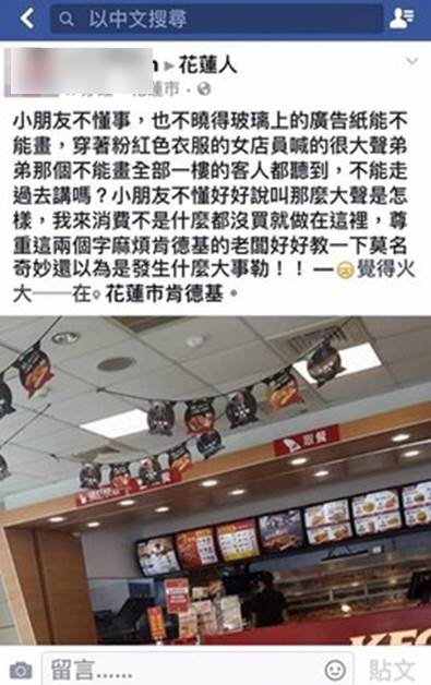 該名媽媽PO文指出,帶著兒子到肯德基消費,「孩子不曉得玻璃上的廣告紙不能畫」,女店員看到後大聲說「弟弟那個不能畫!」聲音大到一樓的客人都聽得到,該名媽媽對此感到相當不滿,「不能走過去講嗎?小朋友不懂好好說叫那麼大聲是怎樣,我來消費不是什麼都沒買就坐在這」,「尊重這兩個字麻煩肯德基的老闆好好教一下,莫名其妙還以為發生什麼大事」