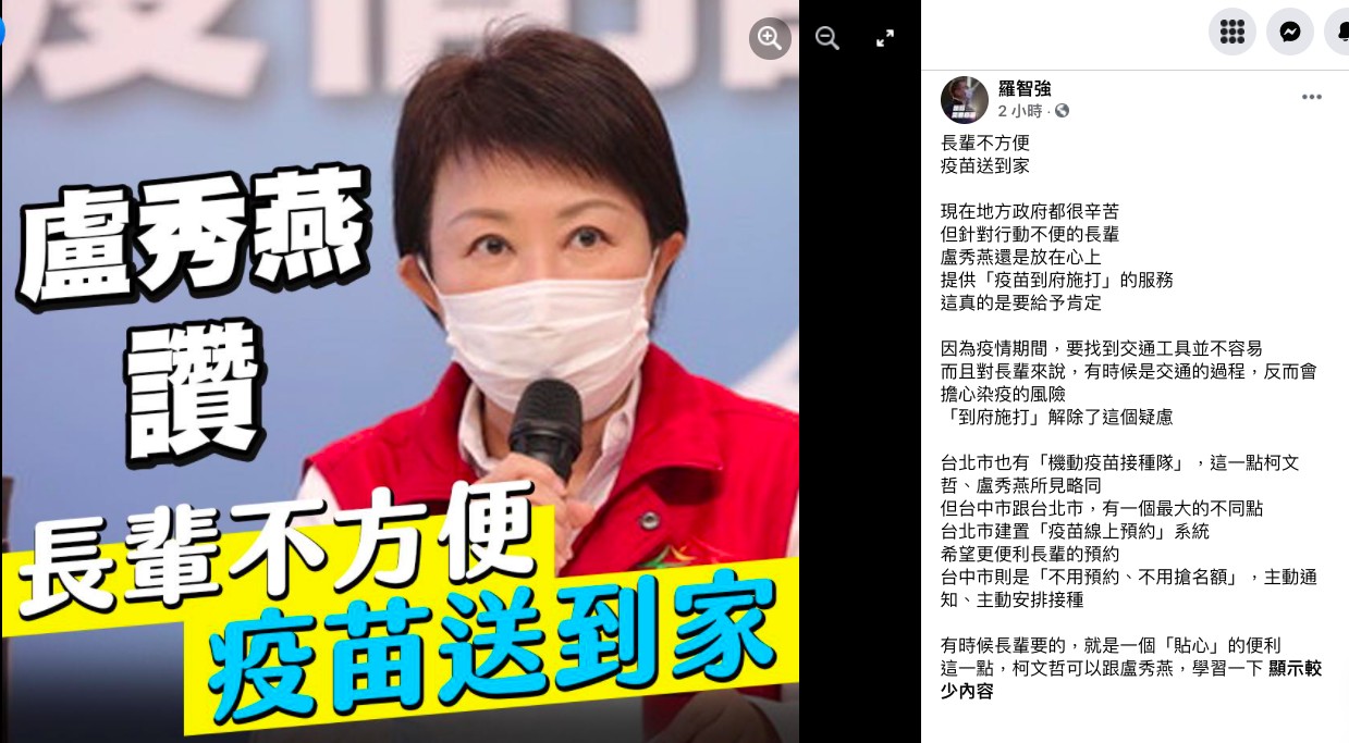 台北市議員羅智強發文表示,現在地方政府都很辛苦,但針對行動不便的長輩,盧秀燕還是放在心上,提供「疫苗到府施打」的服務,這真的是要給予肯定。因為疫情期間,要找到交通工具並不容易,而且對長輩來說,有時候是交通的過程,反而會擔心染疫的風險,「到府施打」解除了這個疑慮。