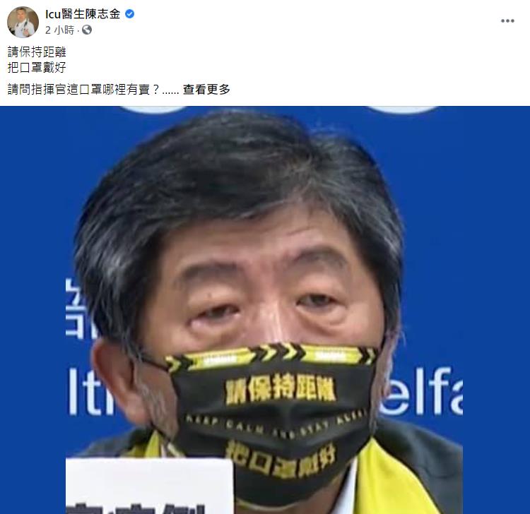 另外,醫師陳志金也在臉書分享發問:「請問指揮官這口罩哪裡有賣?」引來不少網友留言,「可以揪團嗎?」、「這口罩很讚耶,不用開口即達勸導」,還有網友透露,想買該款口罩,只要在拍賣網站上搜尋關鍵字就能找到,有黑、黃兩色可選擇。