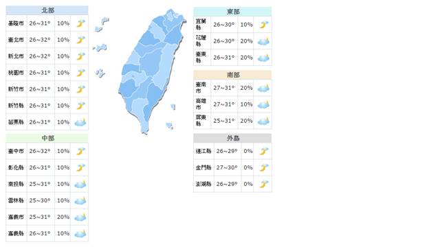 23日時,因為仍在太平洋高壓影響之下,全台各地早上大多為晴到多雲,午後又因熱對流發展,山區及接近山區的平地有局部雷陣雨,請會前往山區或溪邊的民眾多加注意。此外,由於南風帶來一些水氣,台東地區及恆春半島有時會出現零星短暫陣雨。 溫度方面,中午之前各地氣溫偏高,感受炎熱,預計高溫落在33到35度,而北部地區受到南風沉降影響,有可能會出現36、37度高溫,紫外線指數更容易達過量甚至危險等級,所以在戶外活動的民眾務必注意防曬,並適時補充水分預防中暑。 ●(圖/中央氣象局)