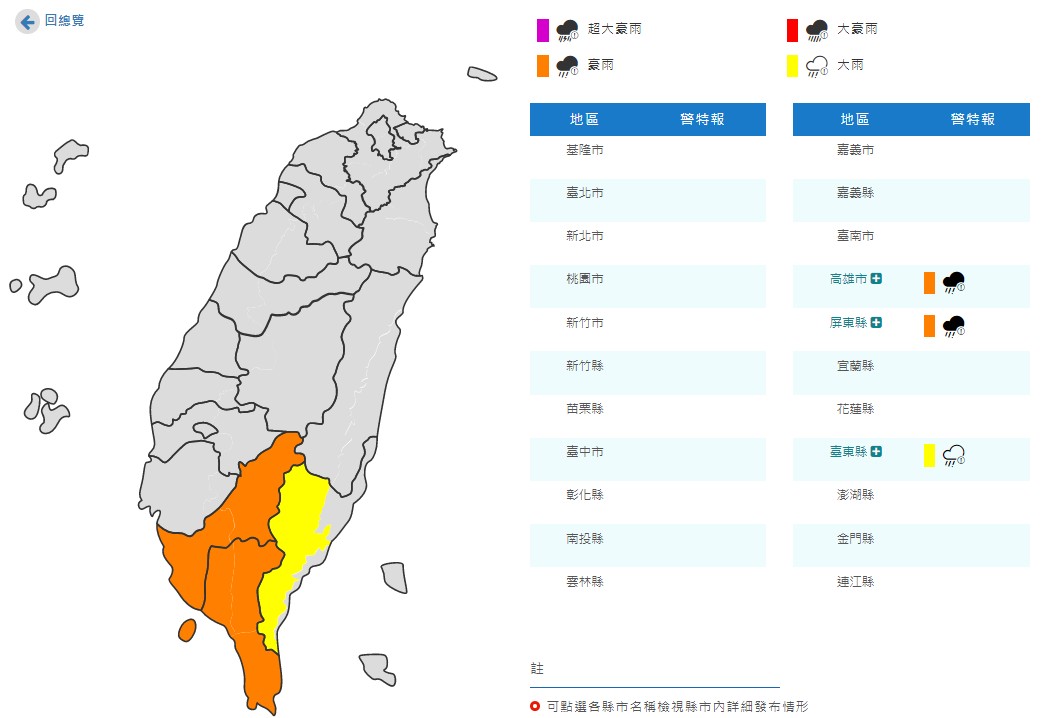 ▼高雄市及屏東縣發布豪雨特報、台東縣大雨特報。(圖/中央氣象局)