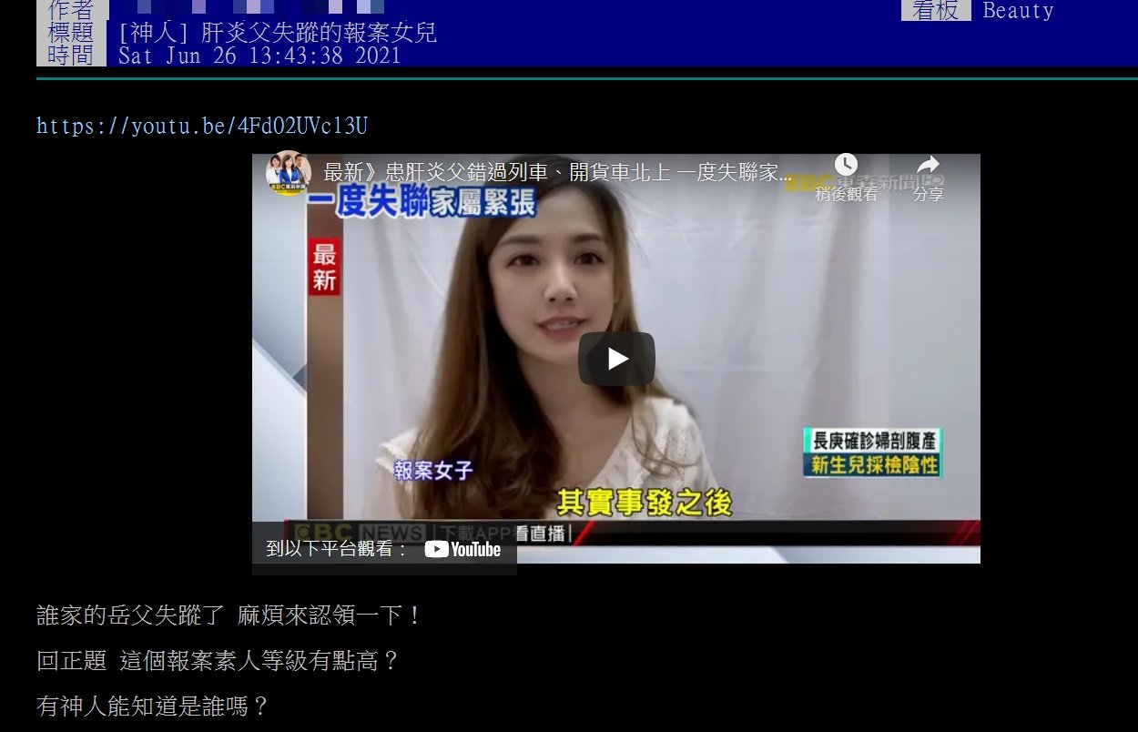 然而事件曝光後,鄉民們卻被彭姓女子的高顏值給吸引,紛紛留言表示,「看到岳父沒事我就放心了」、「岳父下次出門記得帶手機」、「感謝員警幫忙找到岳父大人」、「岳父真是粗心大意」、「岳父你沒事吧,人有找到我就放心了!」甚至有網友將新聞影片PO上PTT表特版求臉書和IG,「這個報案素人等級有點高?有神人能知道是誰嗎?」