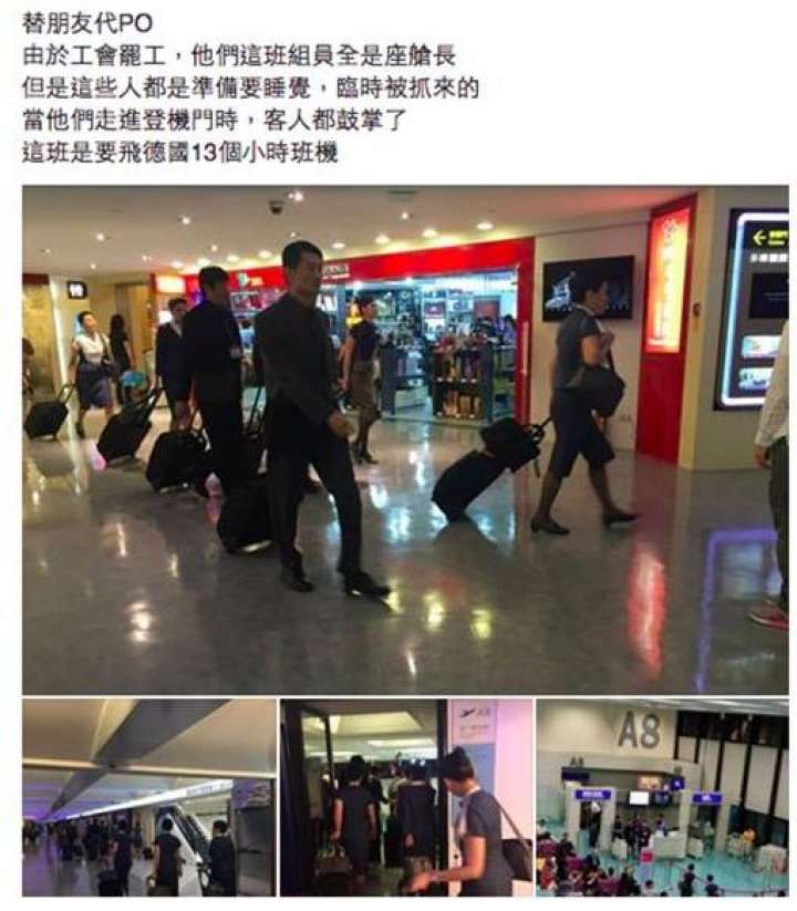 現場也有一名搭乘華航班機的旅客表示,空服人員不能說罷工就罷工「你不能罷我們乘客啊,我們飯店一天要一萬多塊耶,那誰來賠啊?」因此當今日凌晨一架原定飛往德國法蘭克福的CI-61班機,緊急調來「座艙長」們支援,也讓本來擔心因為罷工影響無法順利成行的旅客們,一見到機組人員們到登機門,都站起來鼓掌歡迎這群座艙長們。旅客們表示,當這群被調來支援的「座艙長」們走進登機門的那一刻,所有旅客都為他們鼓掌了,這群人原本是在休息的「而這班飛往德國的班機,預計航行時間有13個小時。」從桃園機場的航班資訊顯示,今日最新一班飛往德國的班機為CI-61,0點57分已準時從桃園機場出發。