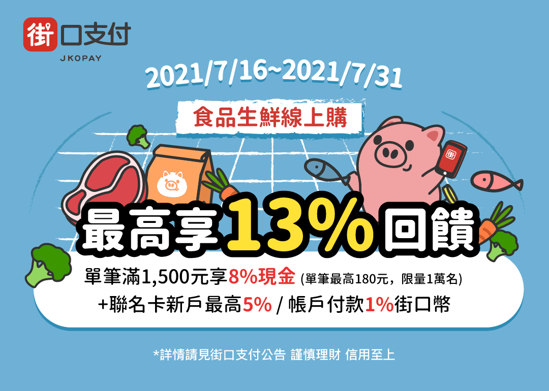 街口支付也觀察到疫情期間,消費者在家自煮的比例提升,且改變採買習慣,從傳統市場、超市,轉向至生鮮食品購物網站採購,相較疫情前生鮮食材訂單量成長超過5倍!街口支付為支持消費者減少外出採買群聚的機會,並鼓勵使用無現金支付,降低傳染風險,聯手超過100間生鮮品牌,最高享13%回饋,安心在家輕鬆採買享好康。