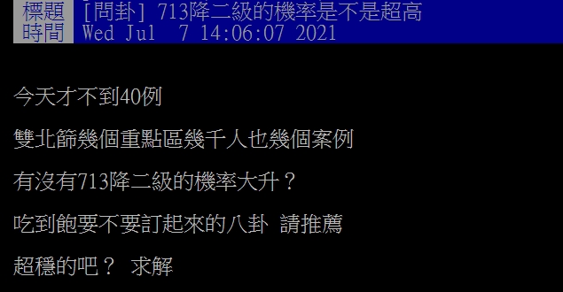今(7)日一名網友在PTT詢問「713降二級的機率是不是超高」,原PO指出今日指揮中心公布,本土確診人數不到40例,個案分布以臺北市與新北市各14例最多、其次為桃園市11例,另外雙北篩檢幾個重點區域,篩檢幾千人只有幾個確診案例,原PO認為「713降二級的機率大升」,他發文詢問網友吃到飽要不要訂起來,並請大家推薦吃到飽餐廳,原PO直言「超穩的吧,求解」。