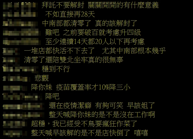 此貼文一出,吸引正反兩派網友熱議,部分網友表示贊同「快解封啦,想吃燒烤了」、「中南部都清零了,真的該解封了」、「一堆店都快活不下去了,尤其中南部根本清零了,還陪雙北坐牢,真的很無辜」、「超穩,我已經受不鳥要瘋狂做菜了」,但也有網友持反面意見,「桃園突然跑11個,你說解封是過2周,要降O小」、「疫苗覆蓋率才10%降O小」、「拜託不要解封,關關開開的有什麼意義」。