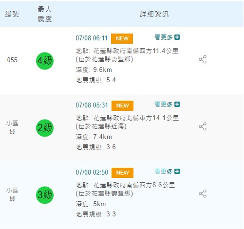 今日上午6點11分左右,花蓮壽豐鄉發生規模5.4地震,震源深度10公里,花蓮4級,南投3級,宜蘭、台中、台東、桃園、彰化、雲林、苗栗、嘉義、台北2級,新竹、高雄、台南、屏東1級。