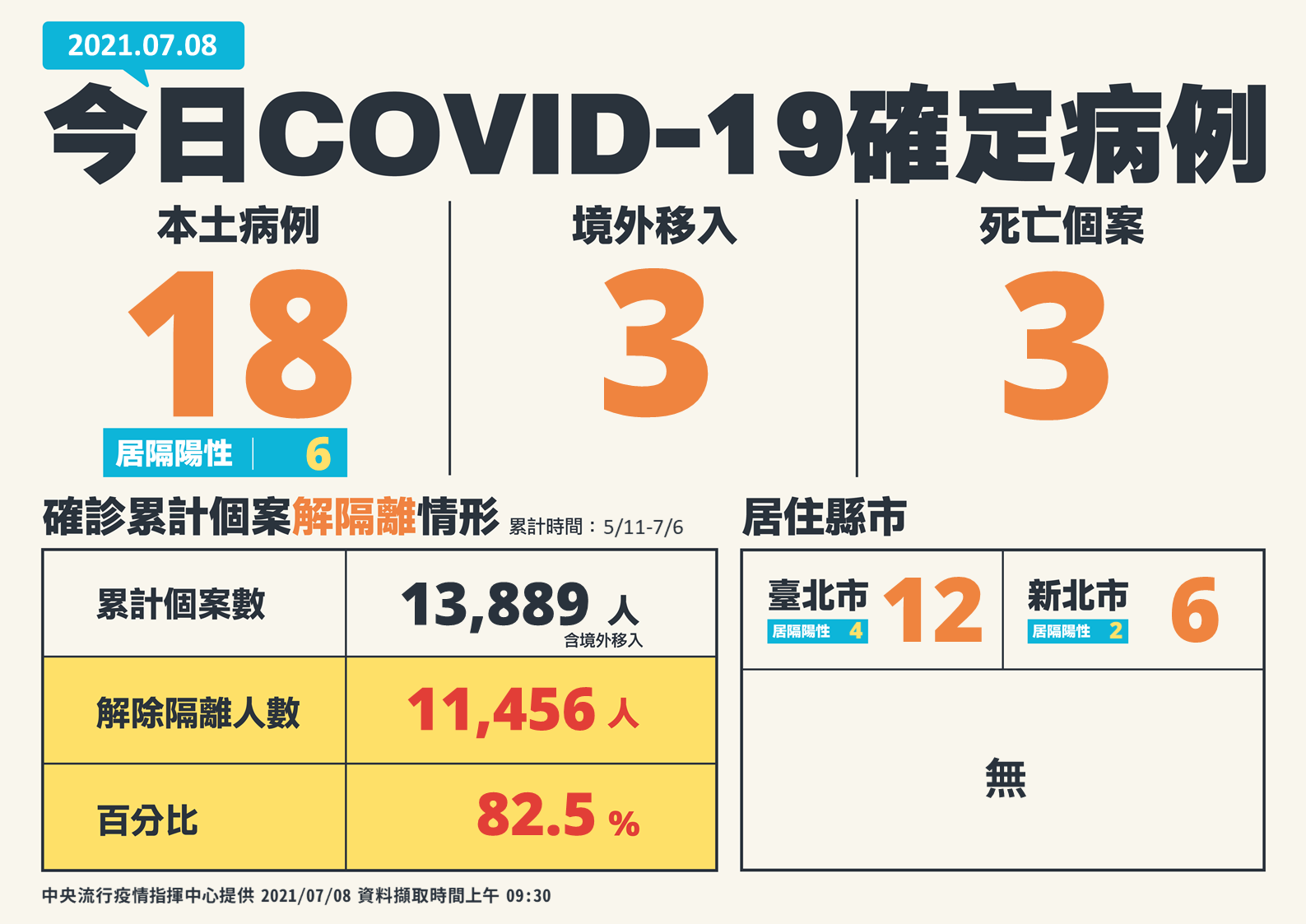 指揮中心表示,今日新增之18例本土病例(其中6例為居家隔離期間或期滿檢驗陽性者),為8例男性、10例女性,年齡介於未滿5歲至60多歲,發病日介於今(2021)年7月1日至7月7日。個案分布以臺北市12例最多,其次為新北市6例;其中9例為已知感染源、9例調查中,相關疫情調查持續進行中。
