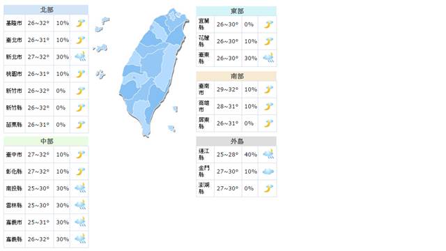 氣象局提醒,中午過後各地要留意午後雷陣雨,特別是山區及接近山區的平地下雨的機率較高,還會有局部較大雨勢發生的機率,所以要前往山區、溪邊活動的民眾請特別留意天氣的變化。此外,迎風面的台東及恆春半島偶爾會有短暫陣雨,下雨的時間不侷限在中午過後,不過雨勢並不會太大。